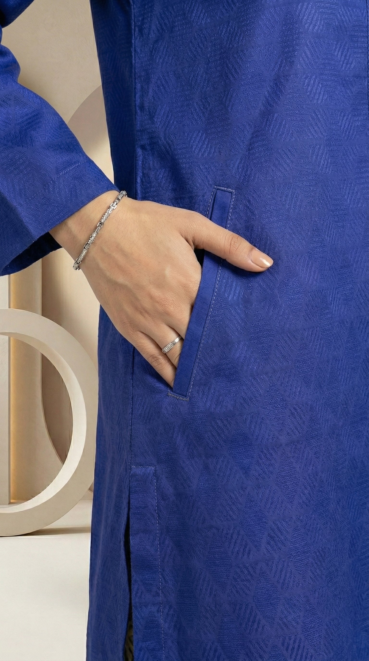 Shirt: Crafted from Premium Self-Jacquard Cambric, featuring a beautiful woven texture that adds a 3D depth to the deep indigo blue.